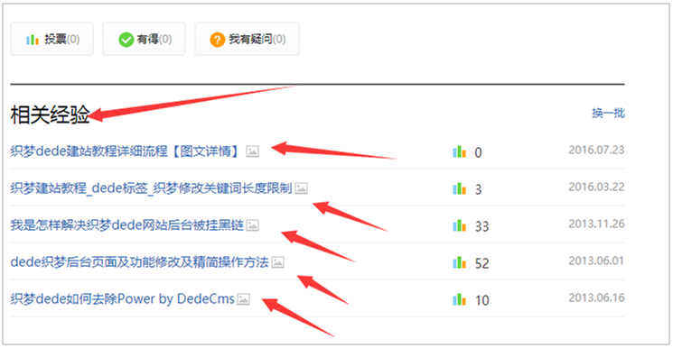 7、相关文章推荐设置。在当前经验文章的下面,百度使用了“相关经验”推送相关文章,一方面加强当前页面的相关性,另外一方面吸引用户继续阅读,增加了浏览者浏览当前页面的停留时间以及访问深度,提升用户体验。